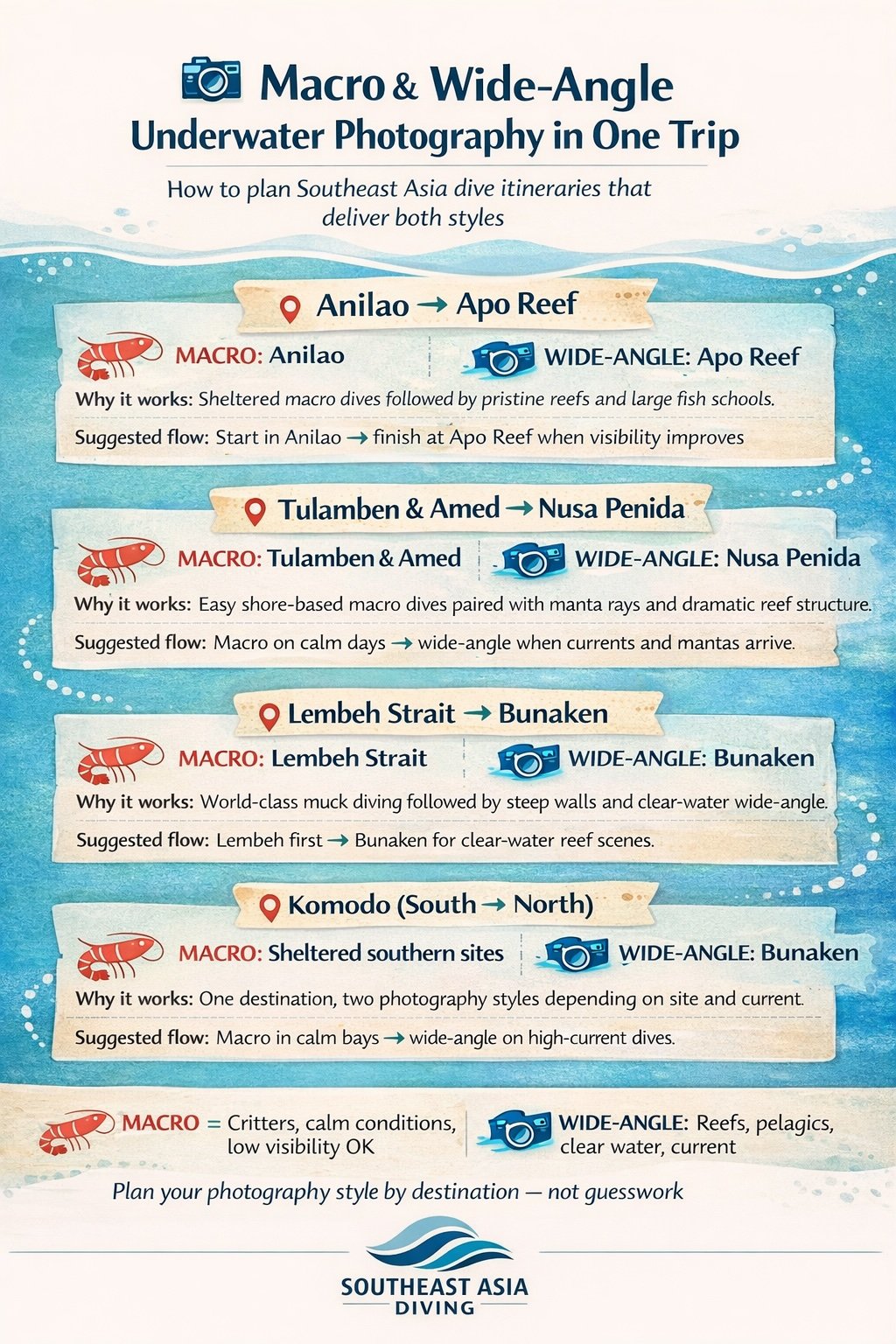 Yes — Southeast Asia is one of the best regions in the world to combine macro and wide-angle photography on a single trip. Many itineraries include sheltered critter dives alongside current-rich reef or pelagic sites. Some photographers bring both setups, while others plan dive days around conditions to maximize success with one style at a time.